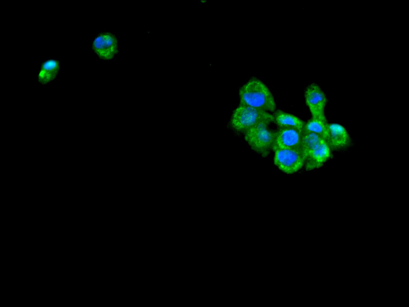 Immunofluorescence staining of A431 cell with CSB-PA757769LA01HU at 1:450, counter-stained with DAPI. The cells were fixed in 4% formaldehyde and blocked in 10% normal Goat Serum. The cells were then incubated with the antibody overnight at 4C. The secondary antibody was Alexa Fluor 488-congugated AffiniPure Goat Anti-Rabbit IgG(H+L).