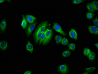 Immunofluorescence staining of A549 cells with CSB-PA853482LA01HU at 1:66, counter-stained with DAPI. The cells were fixed in 4% formaldehyde, permeabilized using 0.2% Triton X-100 and blocked in 10% normal Goat Serum. The cells were then incubated with the antibody overnight at 4°C. The secondary antibody was Alexa Fluor 488-congugated AffiniPure Goat Anti-Rabbit IgG(H+L).
