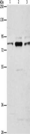 • Gel: 8%SDS-PAGE, Lysate: 40 μg, Lane 1-3: Human brain malignant glioma tissue, A172 cells, 293T cells, Primary antibody: CSB-PA409894(ARHGEF7 Antibody) at dilution 1/800, Secondary antibody: Goat anti rabbit IgG at 1/8000 dilution, Exposure time: 3 minutes