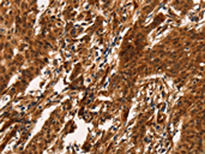 • The image on the left is immunohistochemistry of paraffin-embedded Human gastric cancer tissue using CSB-PA157358(ARL6IP1 Antibody) at dilution 1/20, on the right is treated with fusion protein. (Original magnification: ×200)