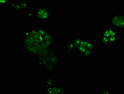 • Immunofluorescence staining of PC-3 cells with CSB-PA002123LA01HU at 1:166, counter-stained with DAPI. The cells were fixed in 4% formaldehyde, permeabilized using 0.2% Triton X-100 and blocked in 10% normal Goat Serum. The cells were then incubated with the antibody overnight at 4°C. The secondary antibody was Alexa Fluor 488-congugated AffiniPure Goat Anti-Rabbit IgG(H+L).