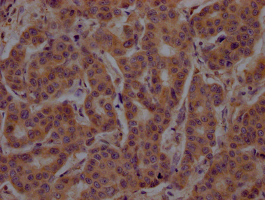 IHC image of CSB-PA002272LA11HU diluted at 1:200 and staining in paraffin-embedded human breast cancer performed on a Leica BondTM system. After dewaxing and hydration, antigen retrieval was mediated by high pressure in a citrate buffer (pH 6.0). Section was blocked with 10% normal goat serum 30min at RT. Then primary antibody (1% BSA) was incubated at 4°C overnight. The primary is detected by a Goat anti-rabbit polymer IgG labeled by HRP and visualized using 0.05% DAB.