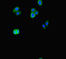 Immunofluorescent analysis of HepG2 cells using CSB-PA843310HA01HU at dilution of 1:100 and Alexa Fluor 488-congugated AffiniPure Goat Anti-Rabbit IgG(H+L)