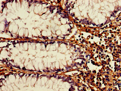 IHC image of CSB-PA002288HA01HU diluted at 1:1200 and staining in paraffin-embedded human colon cancer performed on a Leica BondTM system. After dewaxing and hydration, antigen retrieval was mediated by high pressure in a citrate buffer (pH 6.0). Section was blocked with 10% normal goat serum 30min at RT. Then primary antibody (1% BSA) was incubated at 4°C overnight. The primary is detected by a biotinylated secondary antibody and visualized using an HRP conjugated SP system.