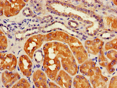 IHC image of CSB-PA002288HA01HU diluted at 1:1200 and staining in paraffin-embedded human kidney tissue performed on a Leica BondTM system. After dewaxing and hydration, antigen retrieval was mediated by high pressure in a citrate buffer (pH 6.0). Section was blocked with 10% normal goat serum 30min at RT. Then primary antibody (1% BSA) was incubated at 4°C overnight. The primary is detected by a biotinylated secondary antibody and visualized using an HRP conjugated SP system.