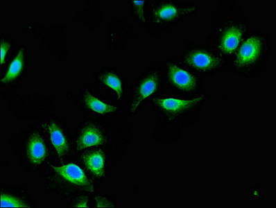 • Immunofluorescent analysis of A549 cells using CSB-PA002290LA01HU at dilution of 1:100 and Alexa Fluor 488-congugated AffiniPure Goat Anti-Rabbit IgG(H+L)