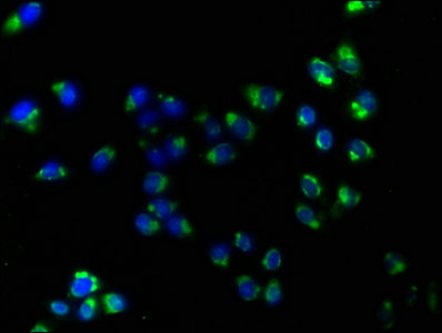 Immunofluorescence staining of Hela cells with CSB-PA002328LA01HU at 1:160, counter-stained with DAPI. The cells were fixed in 4% formaldehyde, permeabilized using 0.2% Triton X-100 and blocked in 10% normal Goat Serum. The cells were then incubated with the antibody overnight at 4°C. The secondary antibody was Alexa Fluor 488-congugated AffiniPure Goat Anti-Rabbit IgG(H+L).