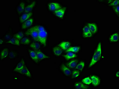 Immunofluorescence staining of Hela cells with CSB-PA23389A0Rb at 1:33, counter-stained with DAPI. The cells were fixed in 4% formaldehyde, permeabilized using 0.2% Triton X-100 and blocked in 10% normal Goat Serum. The cells were then incubated with the antibody overnight at 4°C. The secondary antibody was Alexa Fluor 488-congugated AffiniPure Goat Anti-Rabbit IgG(H+L).