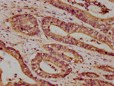 IHC image of CSB-PA23389A0Rb diluted at 1:100 and staining in paraffin-embedded human colon cancer performed on a Leica BondTM system. After dewaxing and hydration, antigen retrieval was mediated by high pressure in a citrate buffer (pH 6.0). Section was blocked with 10% normal goat serum 30min at RT. Then primary antibody (1% BSA) was incubated at 4°C overnight. The primary is detected by a biotinylated secondary antibody and visualized using an HRP conjugated SP system.