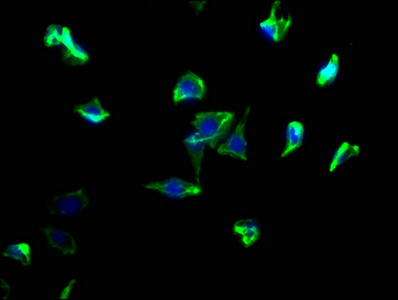 Immunofluorescence staining of SH-SY5Y cells with CSB-PA681474NA01HU at 1:50, counter-stained with DAPI. The cells were fixed in 4% formaldehyde, permeabilized using 0.2% Triton X-100 and blocked in 10% normal Goat Serum. The cells were then incubated with the antibody overnight at 4°C. The secondary antibody was Alexa Fluor 488-congugated AffiniPure Goat Anti-Rabbit IgG(H+L).
