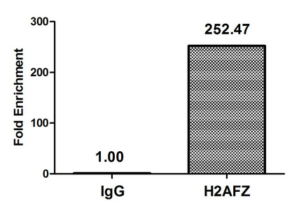 Chromatin Immunoprecipitation Hela (4*106, treated with 30mM sodium butyrate for 4h) were treated with Micrococcal Nuclease, sonicated, and immunoprecipitated with 8µg anti-H2AFZ (CSB-PA010100PA11acHU) or a control normal rabbit IgG. The resulting ChIP DNA was quantified using real-time PCR with primers against the β-Globin promoter.