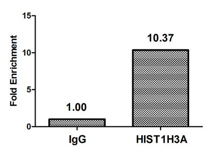 Chromatin Immunoprecipitation Hela (4*106, treated with 30mM sodium butyrate for 4h) were treated with Micrococcal Nuclease, sonicated, and immunoprecipitated with 5µg anti-HIST1H3A (CSB-PA010418PA09acHU) or a control normal rabbit IgG. The resulting ChIP DNA was quantified using real-time PCR with primers against the β-Globin promoter.