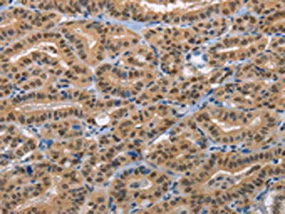 • The image on the left is immunohistochemistry of paraffin-embedded Human thyroid cancer tissue using CSB-PA223753(BAG1 Antibody) at dilution 1/20, on the right is treated with fusion protein. (Original magnification: ×200)