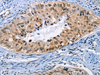 • The image on the left is immunohistochemistry of paraffin-embedded Human cervical cancer tissue using CSB-PA223753(BAG1 Antibody) at dilution 1/20, on the right is treated with fusion protein. (Original magnification: ×200)