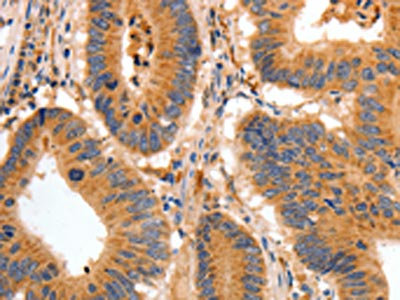 The image on the left is immunohistochemistry of paraffin-embedded Human colon cancer tissue using CSB-PA585175(BAIAP2 Antibody) at dilution 1/30, on the right is treated with fusion protein. (Original magnification: ×200)