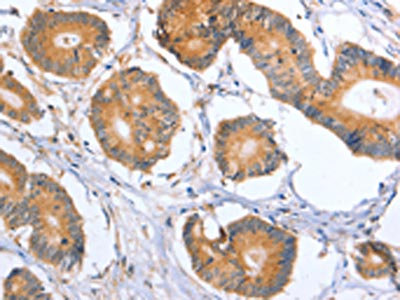 The image on the left is immunohistochemistry of paraffin-embedded Human colon cancer tissue using CSB-PA958582(BLNK Antibody) at dilution 1/50, on the right is treated with synthetic peptide. (Original magnification: ×200)