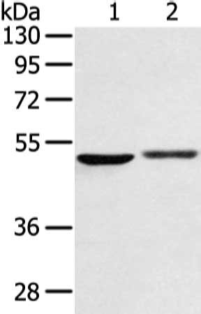 Gel: 8%SDS-PAGE, Lysate: 40 μg, Lane 1-2: Human normal lung and fetal liver tissue, Primary antibody: CSB-PA212919(BMP4 Antibody) at dilution 1/500 dilution, Secondary antibody: Goat anti rabbit IgG at 1/8000 dilution, Exposure time: 1 minute