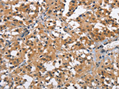 The image on the left is immunohistochemistry of paraffin-embedded Human liver cancer tissue using CSB-PA047722(BRE Antibody) at dilution 1/40, on the right is treated with fusion protein. (Original magnification: ×200)