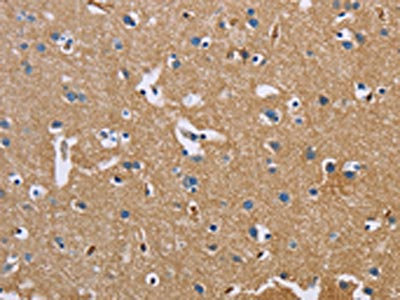 The image on the left is immunohistochemistry of paraffin-embedded Human brain tissue using CSB-PA570608(BSG Antibody) at dilution 1/60, on the right is treated with fusion protein. (Original magnification: ×200)