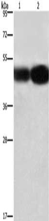 Gel: 8%SDS-PAGE, Lysate: 40 μg, Lane 1-2: A549 cells, 231 cells, Primary antibody: CSB-PA570608(BSG Antibody) at dilution 1/430, Secondary antibody: Goat anti rabbit IgG at 1/8000 dilution, Exposure time: 12 seconds