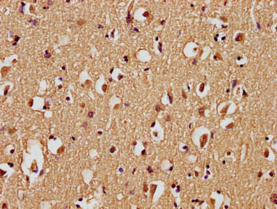 IHC image of CSB-PA868390PA01HU diluted at 1:100 and staining in paraffin-embedded human brain tissue performed on a Leica BondTM system. After dewaxing and hydration, antigen retrieval was mediated by high pressure in a citrate buffer (pH 6.0). Section was blocked with 10% normal goat serum 30min at RT. Then primary antibody (1% BSA) was incubated at 4°C overnight. The primary is detected by a biotinylated secondary antibody and visualized using an HRP conjugated SP system.
