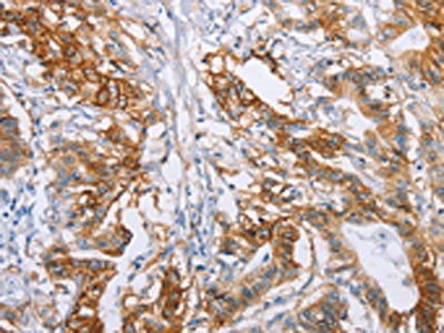 The image on the left is immunohistochemistry of paraffin-embedded Human colon cancer tissue using CSB-PA179189(CA9 Antibody) at dilution 1/50, on the right is treated with fusion protein. (Original magnification: ×200)