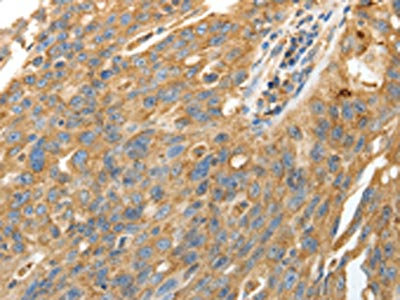 The image on the left is immunohistochemistry of paraffin-embedded Human gastic cancer tissue using CSB-PA314121(CALR Antibody) at dilution 1/50, on the right is treated with fusion protein. (Original magnification: ×200)