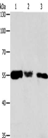 • Gel: 10%SDS-PAGE, Lysate: 40 μg, Lane 1-3: Hela cells, 293T cells, NIH/3T3 cells, Primary antibody: CSB-PA963019(CALR Antibody) at dilution 1/500, Secondary antibody: Goat anti rabbit IgG at 1/8000 dilution, Exposure time: 30 seconds