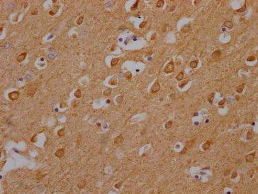 IHC image of CSB-PA892176HA11HU diluted at 1:200 and staining in paraffin-embedded human brain tissue performed on a Leica BondTM system. After dewaxing and hydration, antigen retrieval was mediated by high pressure in a citrate buffer (pH 6.0). Section was blocked with 10% normal goat serum 30min at RT. Then primary antibody (1% BSA) was incubated at 4°C overnight. The primary is detected by a Goat anti-rabbit polymer IgG labeled by HRP and visualized using 0.05% DAB.