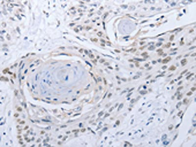 • The image on the left is immunohistochemistry of paraffin-embedded Human esophagus cancer tissue using CSB-PA362118(CAMK2B Antibody) at dilution 1/25, on the right is treated with fusion protein. (Original magnification: ×200)