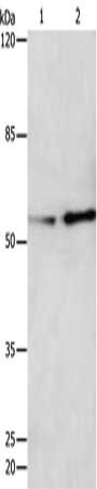 Gel: 10%SDS-PAGE, Lysate: 30 μg, Lane 1-2: Hela cells, HepG2 cells, Primary antibody: CSB-PA256310(CAP1 Antibody) at dilution 1/250, Secondary antibody: Goat anti rabbit IgG at 1/8000 dilution, Exposure time: 20 minutes