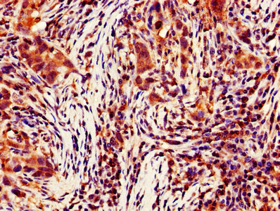 IHC image of CSB-PA004549LA01HU diluted at 1:700 and staining in paraffin-embedded human pancreatic cancer performed on a Leica BondTM system. After dewaxing and hydration, antigen retrieval was mediated by high pressure in a citrate buffer (pH 6.0). Section was blocked with 10% normal goat serum 30min at RT. Then primary antibody (1% BSA) was incubated at 4°C overnight. The primary is detected by a biotinylated secondary antibody and visualized using an HRP conjugated SP system.
