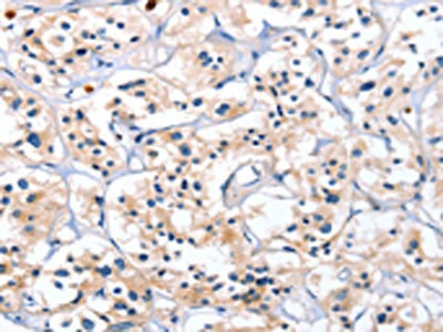 The image on the left is immunohistochemistry of paraffin-embedded Human thyroid cancer tissue using CSB-PA669752(CATSPER1 Antibody) at dilution 1/40, on the right is treated with fusion protein. (Original magnification: ×200)