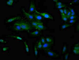 • Immunofluorescence staining of Hela cells with CSB-PA004772LA01HU at 1:100, counter-stained with DAPI. The cells were fixed in 4% formaldehyde, permeabilized using 0.2% Triton X-100 and blocked in 10% normal Goat Serum. The cells were then incubated with the antibody overnight at 4°C. The secondary antibody was Alexa Fluor 488-congugated AffiniPure Goat Anti-Rabbit IgG(H+L).