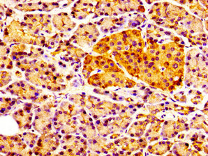 • IHC image of CSB-PA004772LA01HU diluted at 1:100 and staining in paraffin-embedded human pancreatic tissue performed on a Leica BondTM system. After dewaxing and hydration, antigen retrieval was mediated by high pressure in a citrate buffer (pH 6.0). Section was blocked with 10% normal goat serum 30min at RT. Then primary antibody (1% BSA) was incubated at 4°C overnight. The primary is detected by a biotinylated secondary antibody and visualized using an HRP conjugated SP system.