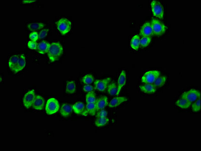 Immunofluorescence staining of PC-3 cells with CSB-PA12619A0Rb at 1:133, counter-stained with DAPI. The cells were fixed in 4% formaldehyde, permeabilized using 0.2% Triton X-100 and blocked in 10% normal Goat Serum. The cells were then incubated with the antibody overnight at 4°C. The secondary antibody was Alexa Fluor 488-congugated AffiniPure Goat Anti-Rabbit IgG(H+L).