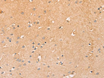 The image on the left is immunohistochemistry of paraffin-embedded Human brain tissue using CSB-PA169235(CCL16 Antibody) at dilution 1/50, on the right is treated with synthetic peptide. (Original magnification: ×200)