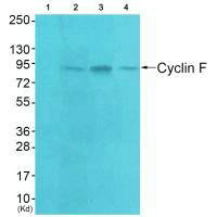 Western blot analysis of extracts from HeLa cells (Lane 2), A549 cells (Lane 3) and HepG2 cells (Lane 4), using Cyclin F antiobdy. The lane on the left is treated with systhesized peptide.