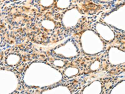 • The image on the left is immunohistochemistry of paraffin-embedded Human thyroid cancer tissue using CSB-PA172806(CCR8 Antibody) at dilution 1/40, on the right is treated with synthetic peptide. (Original magnification: ×200)