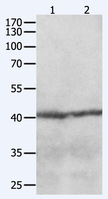 • Gel: 10%SDS-PAGE, Lysate: 80 μg, Lane 1-2: Hela cells, K562 cells, Primary antibody: CSB-PA172806(CCR8 Antibody) at dilution 1/200, Secondary antibody: Goat anti rabbit IgG at 1/8000 dilution, Exposure time: 30 seconds