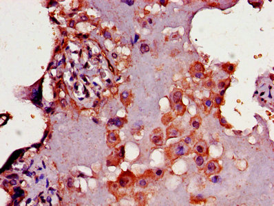 • IHC image of CSB-PA004925LA01HU diluted at 1:300 and staining in paraffin-embedded human placenta tissue performed on a Leica BondTM system. After dewaxing and hydration, antigen retrieval was mediated by high pressure in a citrate buffer (pH 6.0). Section was blocked with 10% normal goat serum 30min at RT. Then primary antibody (1% BSA) was incubated at 4°C overnight. The primary is detected by a biotinylated secondary antibody and visualized using an HRP conjugated SP system.