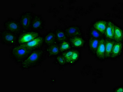 • Immunofluorescent analysis of A549 cells using CSB-PA004931HA01HU at dilution of 1:100 and Alexa Fluor 488-congugated AffiniPure Goat Anti-Rabbit IgG(H+L)