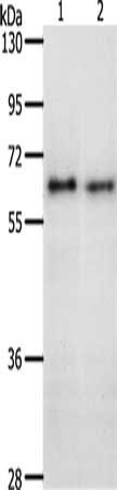 • Gel: 10%SDS-PAGE, Lysate: 40 μg, Lane 1-2: K562 cells, 293T cells, Primary antibody: CSB-PA870444(CDC6 Antibody) at dilution 1/400, Secondary antibody: Goat anti rabbit IgG at 1/8000 dilution, Exposure time: 2 minutes