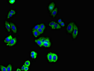 Immunofluorescent analysis of HepG2 cells using CSB-PA005045LA01HU at dilution of 1:100 and Alexa Fluor 488-congugated AffiniPure Goat Anti-Rabbit IgG(H+L)