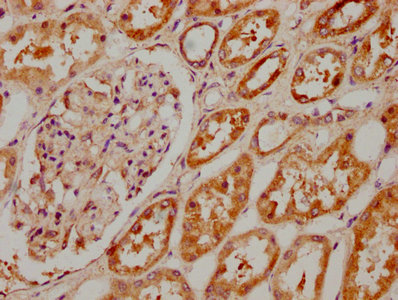 IHC image of CSB-PA361848LA01HU diluted at 1:400 and staining in paraffin-embedded human kidney tissue performed on a Leica BondTM system. After dewaxing and hydration, antigen retrieval was mediated by high pressure in a citrate buffer (pH 6.0). Section was blocked with 10% normal goat serum 30min at RT. Then primary antibody (1% BSA) was incubated at 4°C overnight. The primary is detected by a biotinylated secondary antibody and visualized using an HRP conjugated SP system.