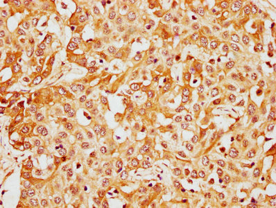 IHC image of CSB-PA13809A0Rb diluted at 1:400 and staining in paraffin-embedded human liver cancer performed on a Leica BondTM system. After dewaxing and hydration, antigen retrieval was mediated by high pressure in a citrate buffer (pH 6.0). Section was blocked with 10% normal goat serum 30min at RT. Then primary antibody (1% BSA) was incubated at 4°C overnight. The primary is detected by a biotinylated secondary antibody and visualized using an HRP conjugated SP system.