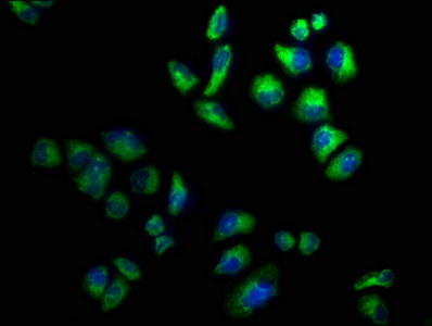 Immunofluorescence staining of Hela cells with CSB-PA005399LA01HU at 1:100, counter-stained with DAPI. The cells were fixed in 4% formaldehyde, permeabilized using 0.2% Triton X-100 and blocked in 10% normal Goat Serum. The cells were then incubated with the antibody overnight at 4°C. The secondary antibody was Alexa Fluor 488-congugated AffiniPure Goat Anti-Rabbit IgG(H+L).