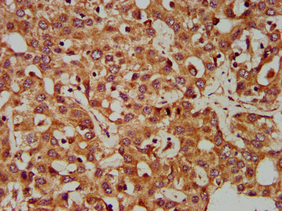 IHC image of CSB-PA857024LA01HU diluted at 1:400 and staining in paraffin-embedded human liver cancer performed on a Leica BondTM system. After dewaxing and hydration, antigen retrieval was mediated by high pressure in a citrate buffer (pH 6.0). Section was blocked with 10% normal goat serum 30min at RT. Then primary antibody (1% BSA) was incubated at 4°C overnight. The primary is detected by a biotinylated secondary antibody and visualized using an HRP conjugated SP system.