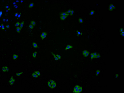 • Immunofluorescence staining of HepG2 cells with CSB-PA005492LA01HU at 1:100, counter-stained with DAPI. The cells were fixed in 4% formaldehyde and blocked in 10% normal Goat Serum. The cells were then incubated with the antibody overnight at 4°C. The secondary antibody was Alexa Fluor 488-congugated AffiniPure Goat Anti-Rabbit IgG(H+L).