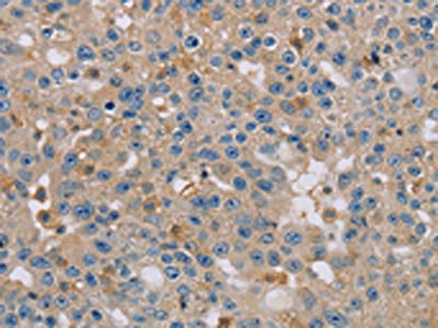 The image on the left is immunohistochemistry of paraffin-embedded Human breast cancer tissue using CSB-PA347049(CLIC1 Antibody) at dilution 1/30, on the right is treated with fusion protein. (Original magnification: ×200)